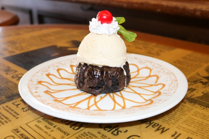 Vanilla ice cream with chocolate sauce, whipped cream and a cherry on top
