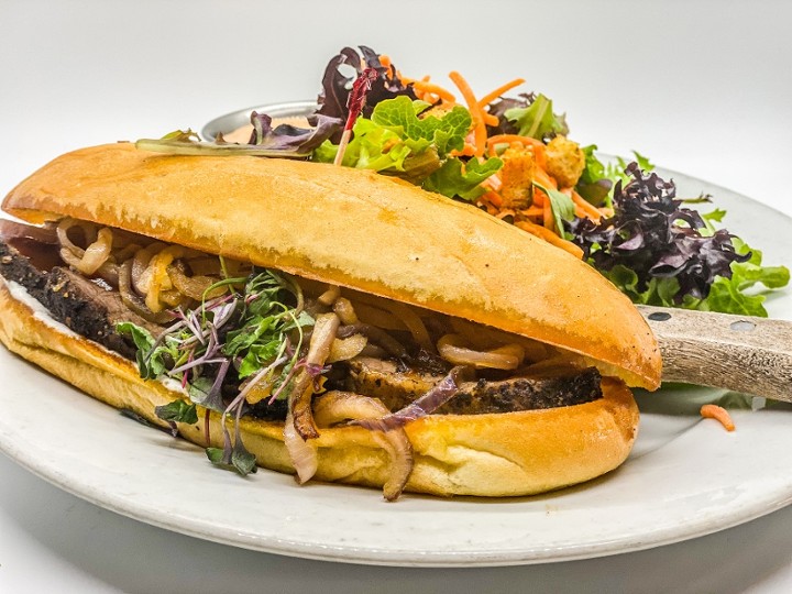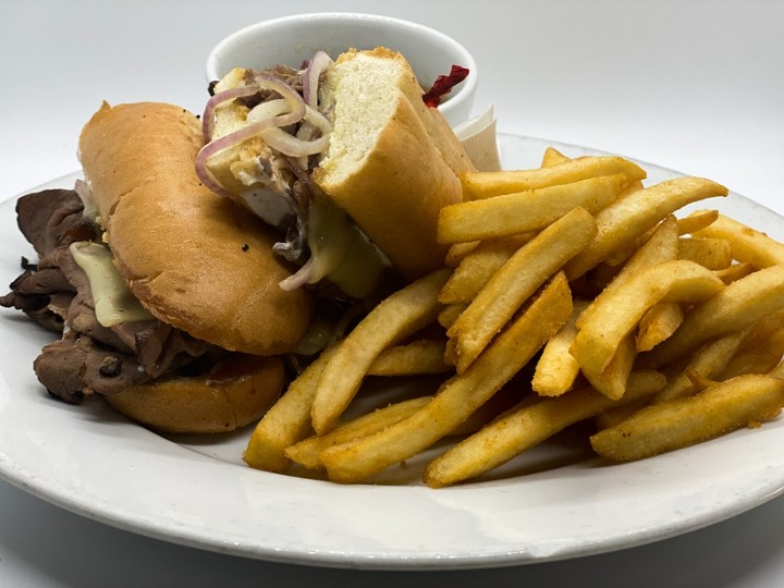 Thinly sliced roast beef with grilled onions, swiss cheese and creamy horseradish aioli. Served on a fresh French roll.